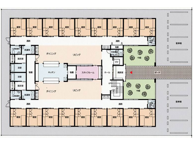 2ユニットの運営で個室が18室ございます。利便性がよく自然豊かな恵まれた環境に加え、オレンジがさわやかな印象を与える外観で、駐車・通路スペースもしっかり確保しておりますし、また中庭の菜園では、入居者の皆様が野菜等を育てているなど、安らぎに満ちた快適な生活を送っております。